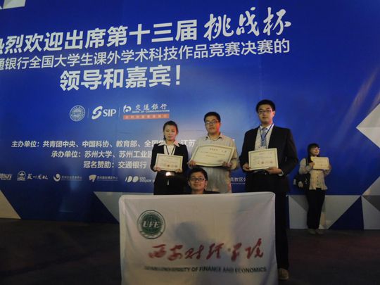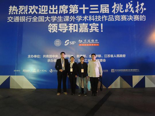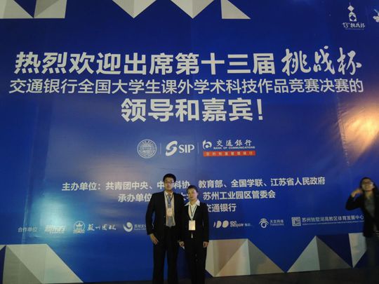 2013年10月17日,十三届“挑战杯”交通银行全国大学生课外学术科技作品竞赛颁奖仪式在江苏苏州工业园区如期举行。该赛事是由共青团中央、中国科协、教育部、全国学联和江苏省人民政府共同主办,苏州大学、苏州工业园区承办,竞赛决赛在苏州大学举行,代表了全国大学生课外学术科技作品的最高水平。