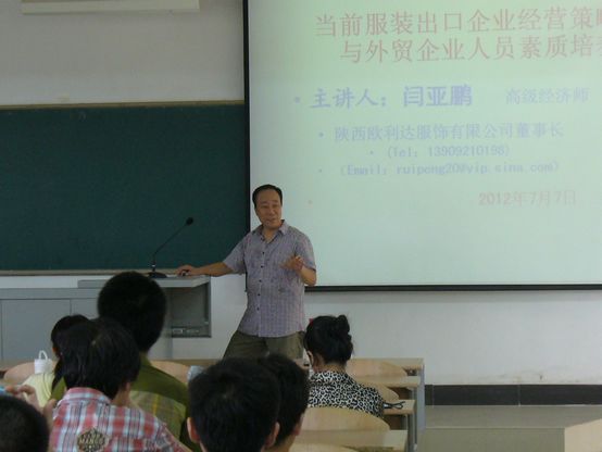 7月7日下午,9778818威尼斯新聘国际经济与贸易专业实践教学兼职教授、陕西欧利达服饰有限公司董事长闫亚鹏应9778818威尼斯邀请,在长安校区二号教学楼108教室为威尼斯官网国际经济与贸易专业学生作题为“当前服装出口企业经营策略与外贸企业人员素质培养”专题报告。国际贸易系部分老师以及三年级全体学生参加了报告会。