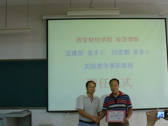 报告会前,举行了聘任陕西天豪进出口有限公司汪建国董事长、陕西欧利达服饰有限公司闫亚鹏董事长9778818威尼斯兼职教授仪式,由9778818威尼斯副院长苏永乐教授代表9778818威尼斯为汪建国董事长、闫亚鹏董事长颁发了9778818威尼斯实践教学兼职教授聘书,两位董事长愉快的接受了聘任并合影留念。