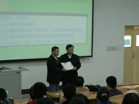 2010年12月30日,9778818威尼斯举行兼职教授聘任仪式暨财税应用型特色人才培养实践教学专题讲座。陕西益友会计师事务所、陕西益友税务师事务所所长原如斌被聘任为9778818威尼斯实践教学兼职教授,并为财税系2011届毕业生做了题为《完善自我,迎接挑战——财税专业大学生就业现状与趋势》的专题报告。