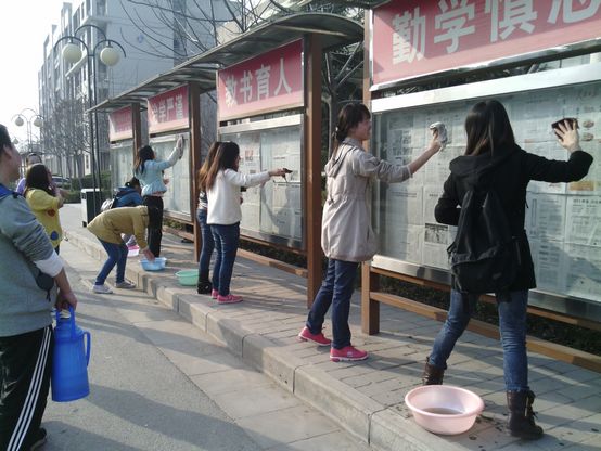 2013年3月5日下午,在“学习雷锋精神”团日活动中,为了同学们更好地理解新时期“雷锋精神”的内涵,维护和谐清洁的校园环境,保持校园整洁美观,构建和谐校园。经济1103班的全体同学对学校宣传栏进行了认真仔细的清理和打扫。